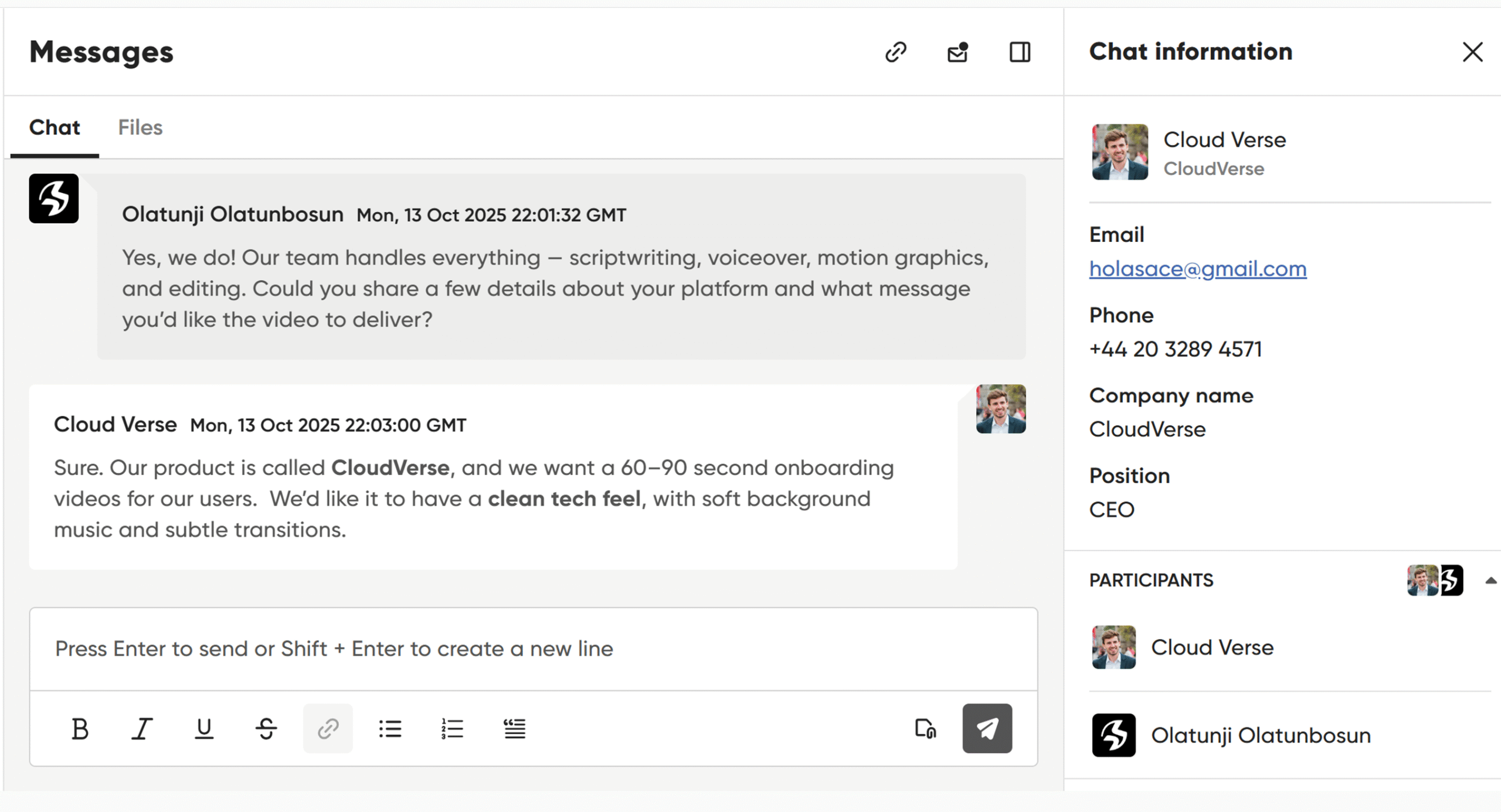 All updates, messages, and quotes, arrive straight in your dashboard inbox — and you can reply directly from email, slack or messenger