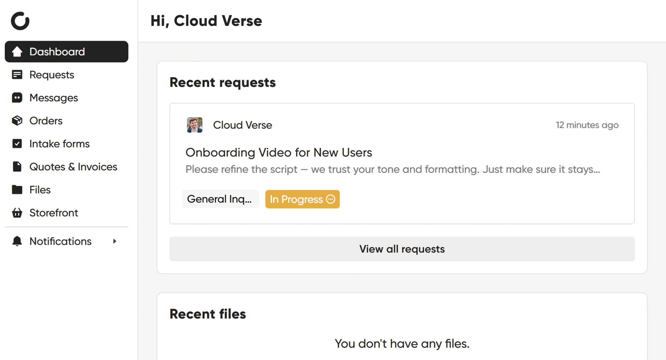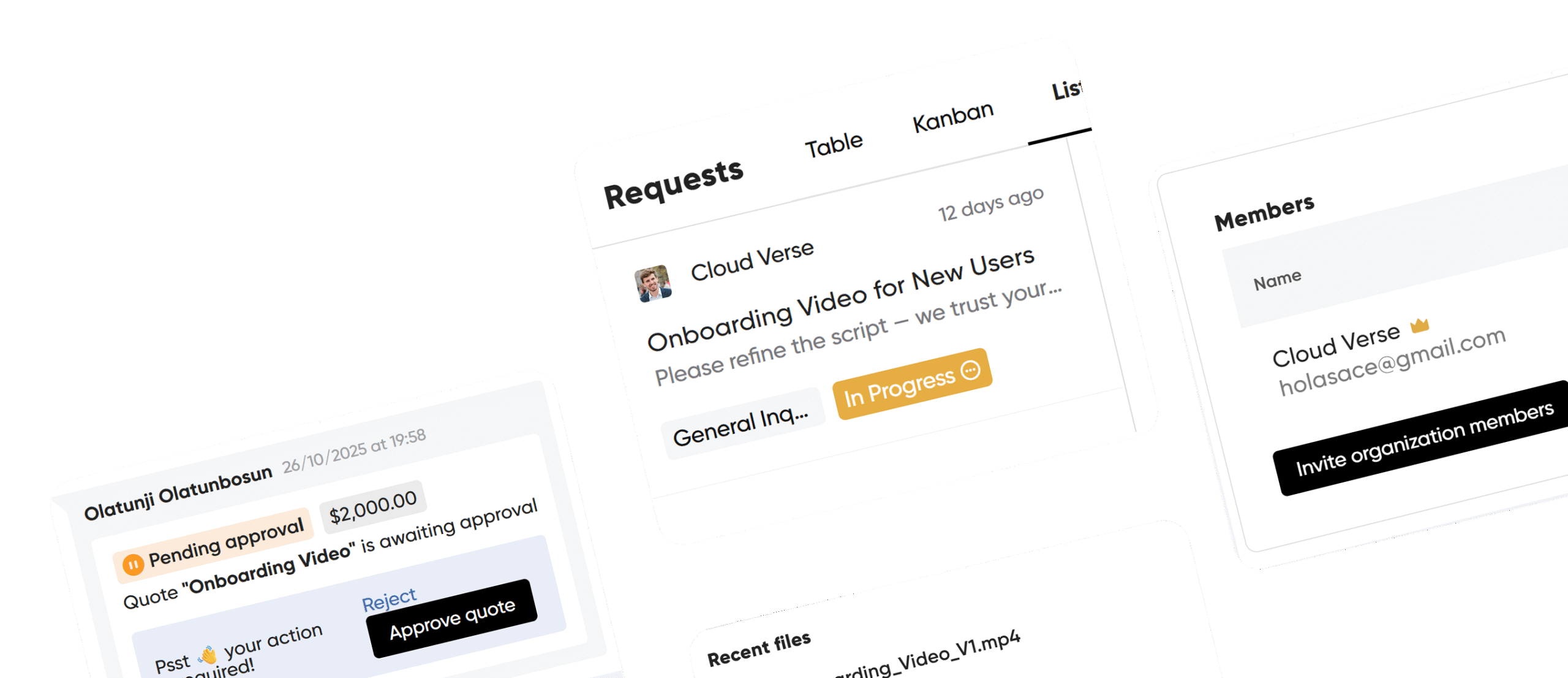 Access a secure dashboard to manage projects, upload files, chat with your team, track progress, and receive final video deliveries — all in one place.